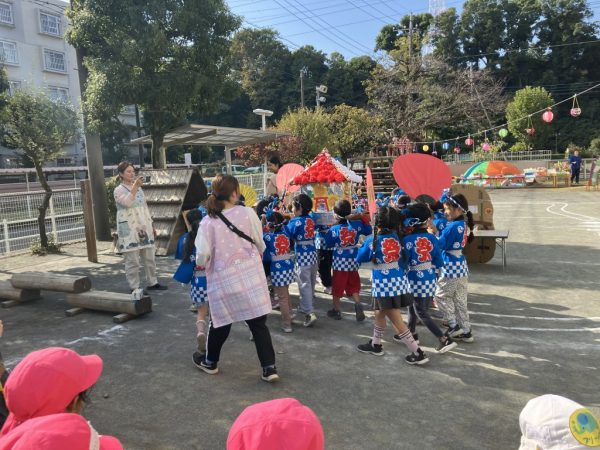 秋祭りは、すみれ保育園さんと一緒に楽しみました。年長さんはすみれ保育園の年長さんと出し物を一緒に考えたり、おみこし、お店屋さんと大奮闘!
